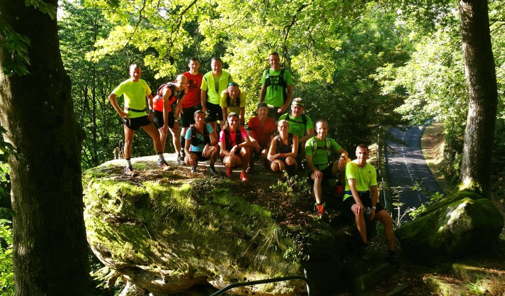 Une sortie ouverte Vosgirugueuse, pour certains, mais surtout Vosgiheureuse, pour tous, à la Petite Pierre entre le rocher du corbeau, le rocher des païens, le rocher blanc, celui de la grenouille, le Loosthal, Imbsthal et la maison des païens. 18 km et 600 m de D+ de pur bonheur avec au final une dégustation mémorable des productions des microbrasseries de Spachsbach !