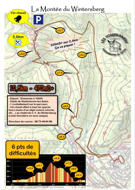 Il s'agit d'un tracé varié, nerveux et technique. Les 5 premiers Km se déroulent sur des routes ou de larges chemins où le dépassement est aisé. Même dans la montée en lacets vers la Tour il y a assez de place pour doubler. Les sentiers simple trace de la descente étant très techniques, les dépassements seront dangereux, soyez très prudents ! Par contre entre chaque portion de sentier vous aurez des chemins larges permettant de doubler sans problème. N'oubliez pas qu'une fois redescendu à la source du Lichteneck, vous serez au pied du Grand Wintersberg : c'est le point bas du parcours, à partir de là il s'agira de remonter au Stade, et il restera encore environ 1,5 Km. Gardez-en sous la semelle !