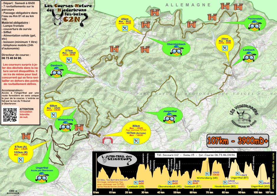L'Ultra des Seigneurs. Toujours plus long, toujours plus exigeant : la course consistera à effectuer le Défi des Seigneurs, puis de repartir du gymnase pour une boucle d'une trentaine de kilomètres. Tracer un ultra dans le Parc Régional des Vosges du Nord n'est pas une prouesse en soi. Encore faut-il que ce parcours ait un sens et qu'il soit attractif. La "rallonge" que nous avons ajoutée au Défi des Seigneurs répond à ce cahier des charges. La trentaine de kilomètres et ces 900D+ supplémentaires vous feront passer par la Wasenbourg, l'Arnsbourg, la Tour du Wasenkoepfel et autres pierres cupules. Des sentiers simple trace, des montées franches et des descentes joueuses, voilà le programme. Et il faudra bien intégrer que la Tour du Wintersberg ne constituera plus le point d'orgue de la course ! Car après la descente sur Niederbronn qui suit le passage de la Tour, il faudra encore avoir du jus pour repartir du gymnase et se lancer à l'assaut du massif du Wasenberg, de l'autre côté de la route de contournement de Niederbronn. L'Ultra des Seigneurs ne s'offrira pas à tout le monde : les barrières horaires seront drastiques et il y aura des déçus qui seront bloqués au bout des 80Km du Défi des Seigneurs. Oserez-vous relever ce challenge ?